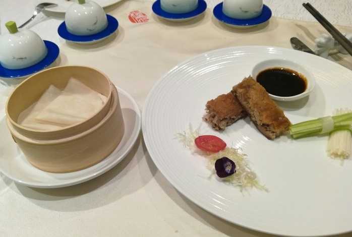 厨师长特别推荐,裹饼放葱丝蘸酱吃,吃法类似北京烤鸭。若想细品鸭皮的酥脆,可以尝试蘸椒盐吃。