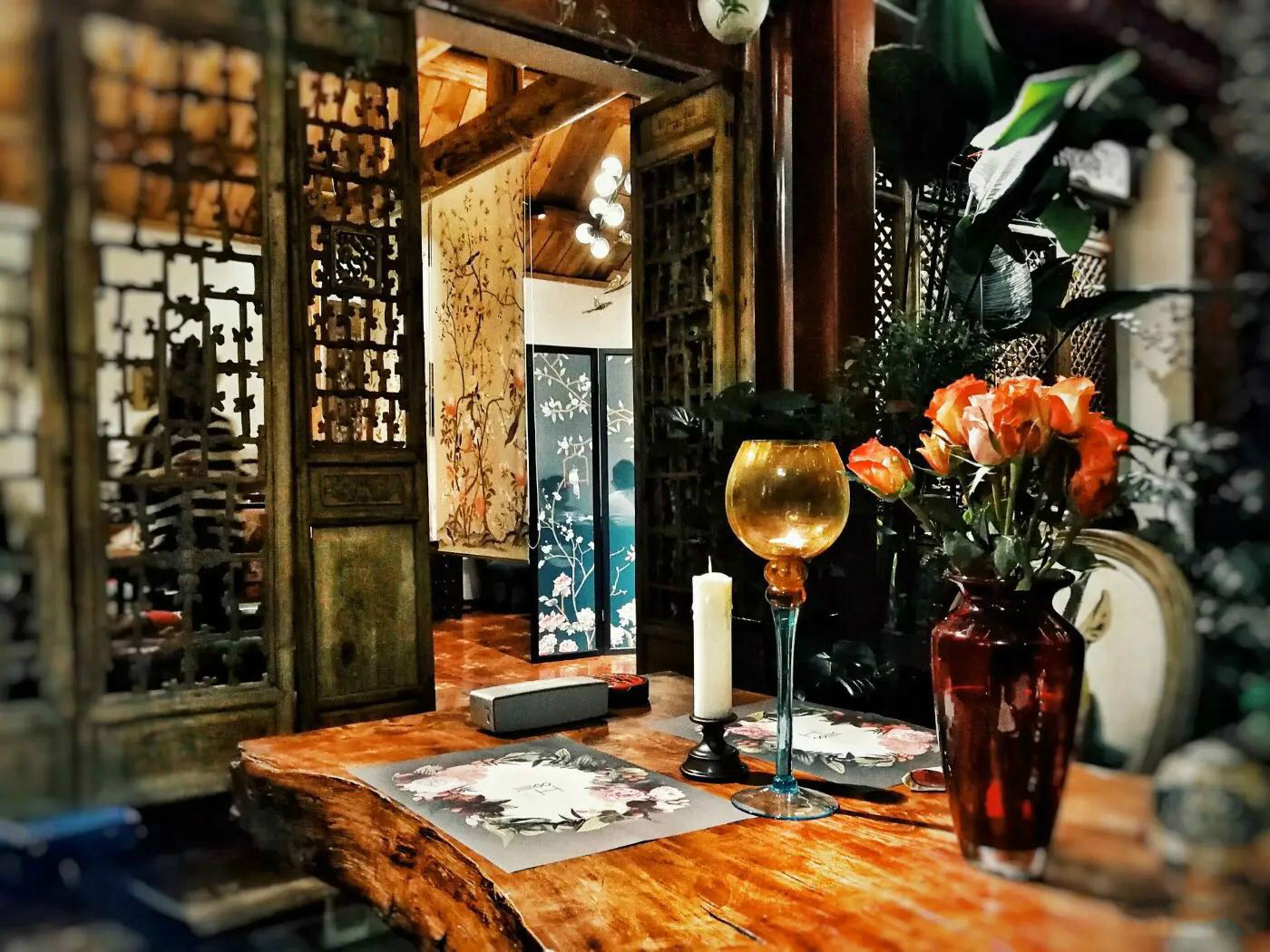 院内花将近一年时间,手工将四合院装上恒温系统和新风系统,种满四季花草,二楼宽敞的空中花园景致美好,在寸土寸金的东城老区显得尤为珍贵。地下历史悠久的防空洞,也被改造成了恒温酒窖。老板娘是一位传统工艺和古董家具修复的手艺人,院内的门窗物件,都是她四处游历收回的老东西,经打磨、抛光、擦漆后,得以重现当年的精美雕花;屏风、桌椅、灯盏等装饰,大多也是在各地淘回来,所以数人用餐的一桌,椅子可能是不一样的。包括餐具、餐布和纸巾在内的每件物品,并不刻意成套搭配,但浓烈奔放的色彩、图案浑然天成,美得像饱满的油画。还有一只会说话的鹦鹉和萌猫,为用餐时光增添些许趣味。